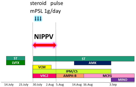 Multidisciplinary therapy was administered, including artificial respiration, antibiotics, antifungal agents, and systemic steroid pulse therapy. Various colors were used to clearly illustrate the types of antibiotics and their duration of use. Blue arrows indicated steroid pulse therapy using 1 gram per day of methylprednisolone. Red arrow and dashed line indicated the period during which NIPPV was performed. NIPPV: noninvasive positive pressure ventilation; ST: Sulfamethoxazole/Trimethoprim; LVFX: Levofloxacin; AMK: amikacin; VCM: Vancomycin; IPM/CS: Imipenem/Cilastatin; VRCZ: Voriconazole; AMPH-B: Amphotericin B; MCFG: Micafungin; MINO: minomycin; mPSL: methylprednisolone.