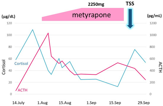 Metyrapone was administered to suppress excessive cortisol. The daily dose was started at 750 mg and gradually increased up to 2250 mg. Transsphenoidal surgery (TSS) was performed on 24 September; however, ACTH and cortisol levels remained unchanged. The vertical axis denotes ACTH and cortisol levels. The horizontal axis denotes time. 7/14: 14 July. The black and gray line graphs indicate serum cortisol and plasma ACTH levels, respectively.