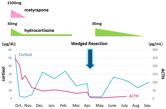Ectopic ACTH syndrome was controlled in combination with metyrapone and hydrocortisone. In due clinical course, ACTH and cortisol levels gradually decreased, suggesting cyclic Cushing’s syndrome. Right middle lobectomy was performed on 10 April. The vertical axis denotes ACTH and cortisol levels. The horizontal axis is for time. 10/6: 6 October. The black and gray line graphs indicate serum cortisol and plasma ACTH levels, respectively.