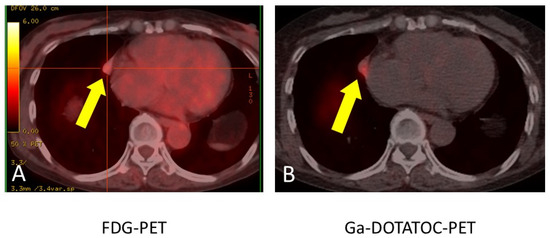 - Deleu, A.-L.; Laenen, A.; Decaluwé, H.; Weynand, B.; Dooms, C.; De Wever, W.; Jentjens, S.; Goffin, K.; Vansteenkiste, J.; Van Laere, K.; et al. Value of [68Ga] Ga-somatostatin receptor PET/CT in the grading of pulmonary neuroendocrine (carcinoid) tumours and the detection of disseminated disease: Single-Centre pathology-based analysis and review of the literature. EJNMMI Res. 2022, 12, 28. [Google Scholar] [CrossRef]