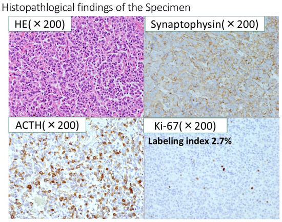 Immunohistochemically, the resected specimen revealed that the tumor was positive for synaptophysin, chromogranin A, CD56, and ACTH. The final diagnosis was ACTH-producing neuroendocrine tumor. The Ki-67-labeling index of the tumor cells was 2.7%.
