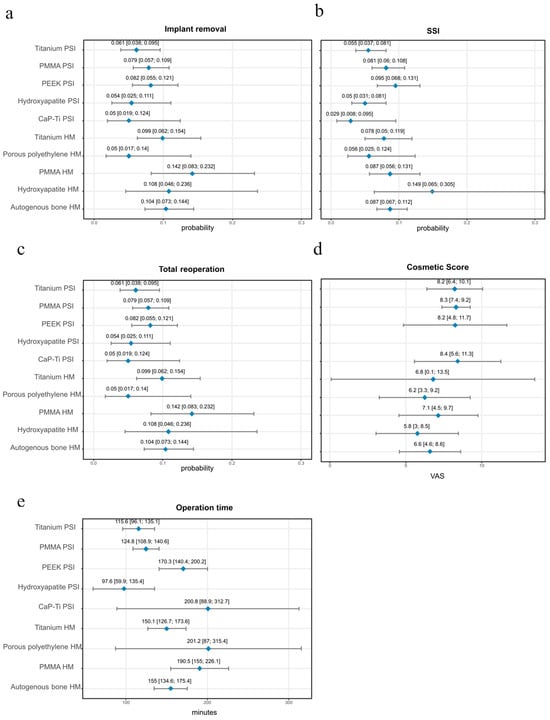Visualized Meta-Regression estimates with 95% CI for implant materials. None of the single-arm analyses reached statistical significance. (a) Implant removal; (b) SSI; (c) Total reoperation; (d) Cosmetic Score; (e) Operation time. PSI: Patient-Specific Implant, HM: Hand-molded, SSI: Surgical Side Infection, CI: Confidence Interval, VAS: Visual Analogue Scale, PMMA: Polymethylmethacrylate, PEEK: Polyetheretherketone, CI: Confidence Interval.