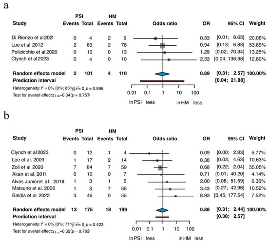 A total of eight comparative two-arm studies allowed for the evaluation of implant removal rates between PSIs and HM implants [3,22,28,40,45,83,102,138]. Separate subgroup analyses were performed for titanium and PMMA implants, as illustrated in Figure 2. Across studies including 101 patients treated with PSIs and 110 patients with HM titanium implants, the OR for implant removal was 0.34 in favor of PSIs (95% CI 0.11–1.03; p = 0.053). In studies involving 155 patients in the PMMA PSI group and 99 in the HM group, the OR was 0.56 (95% CI 0.21–1.54; p = 0.188), again indicating a trend toward fewer removals in the PSI group, though not statistically significant. Table S3 summarizes the results of the one arm analyses for implant removal, showing that all PSI materials demonstrated lower probabilities of explantation compared to HM implants of the same material. Across all included studies, PSIs consistently reduced the risk of postoperative removal, with titanium and PMMA PSIs showing lower rates than their HM counterparts, with the strongest effect being observed for titanium (Figure 3a). In pooled analyses, PSI materials such as CaP-titanium and hydroxyapatite exhibited the lowest explantation rates (<6%), whereas HM PMMA showed the highest rate (14.2%). These findings indicate a consistent advantage of PSIs across materials, although statistical significance was not uniformly achieved in the two-arm subgroup comparisons.