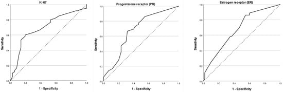 For ER, the AUC was 0.679 (95% CI, 0.571–0.787; p = 0.003). An optimal cut-off of 82.5% ER-positive tumour cells, derived from the Youden index, yielded a sensitivity of 58.3% and a specificity of 63.3%. PR demonstrated an identical AUC of 0.679 (95% CI, 0.571–0.788; p = 0.003). At the optimal cut-off of 25.0% PR-positive cells, sensitivity was 66.7% and specificity 68.3%. Ki-67 achieved the highest AUC among the three markers (0.696; 95% CI, 0.587–0.805; p = 0.001). A cut-off of 17.5% for Ki-67 yielded a sensitivity of 63.3% and a specificity of 69.4%.