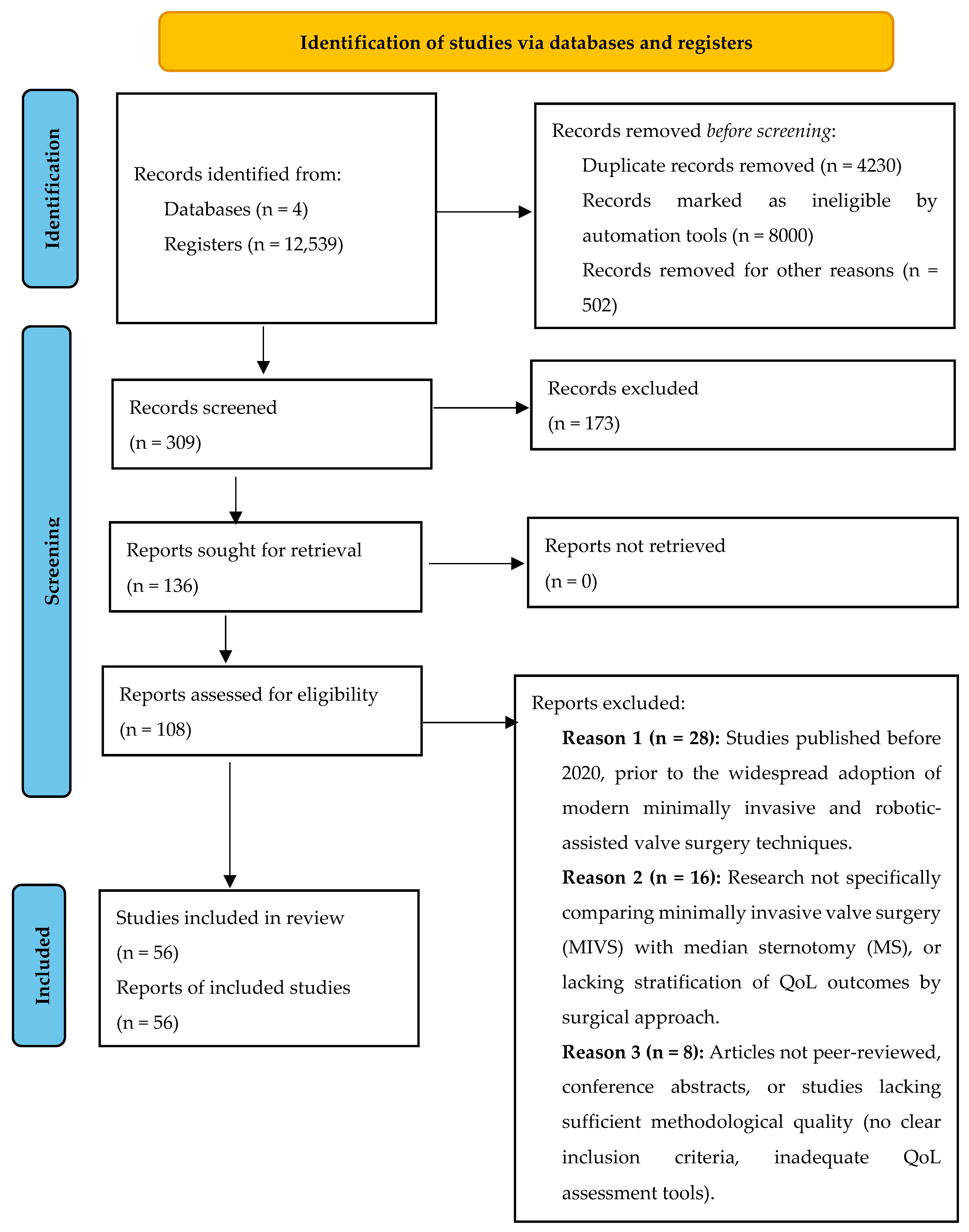 - After removal of 4230 duplicate records, 309 titles and abstracts were screened. Of these, 173 records were excluded for not meeting inclusion criteria (e.g., non-surgical focus, absence of minimally invasive or sternotomy comparison, non-valvular populations, or lack of QoL assessment).