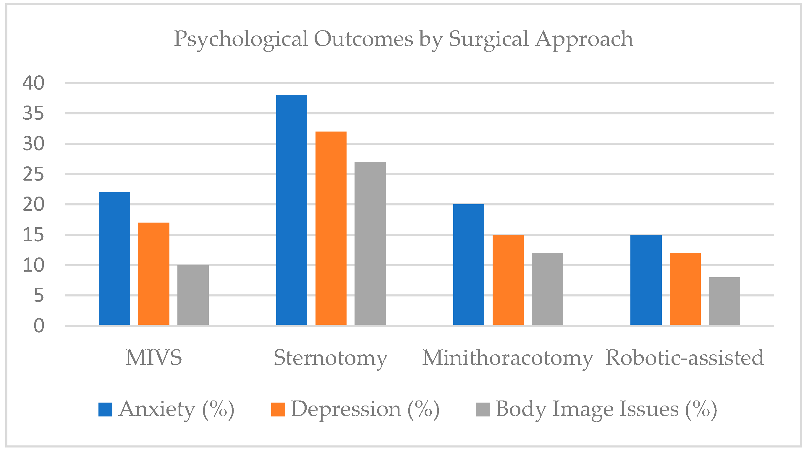 | Partial Upper Sternotomy (hybrid MIVS) | SF-36 PCS: 50 (SD 8); comparable pain relief to full sternotomy but faster discharge | SF-36 MCS: 49 (SD 8); 20% anxiety; 18% depression | 70% early social reintegration; 68% cosmetic satisfaction | 6–18 months | SF-36 | 250–700 | Intermediate QoL improvement; physical benefits stronger than psychological [19,20] |