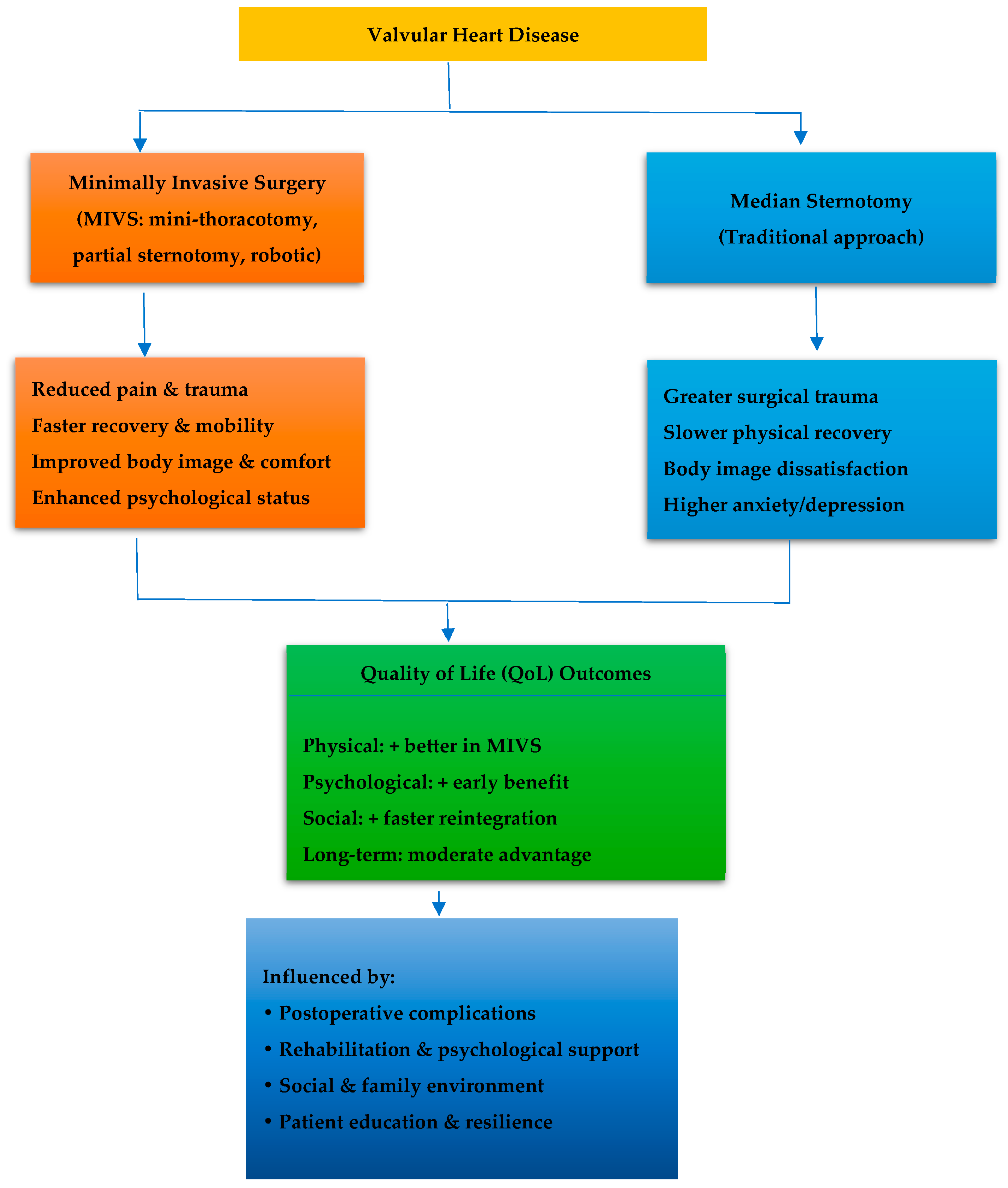 - Claessens, J.; Rottiers, R.; Vandenbrande, J.; Gruyters, I.; Yilmaz, A.; Kaya, A.; Stessel, B. Quality of Life in Patients Undergoing Minimally Invasive Cardiac Surgery: A Systematic Review. Indian J. Thorac. Cardiovasc. Surg. 2023, 39, 367–380. [Google Scholar] [CrossRef]