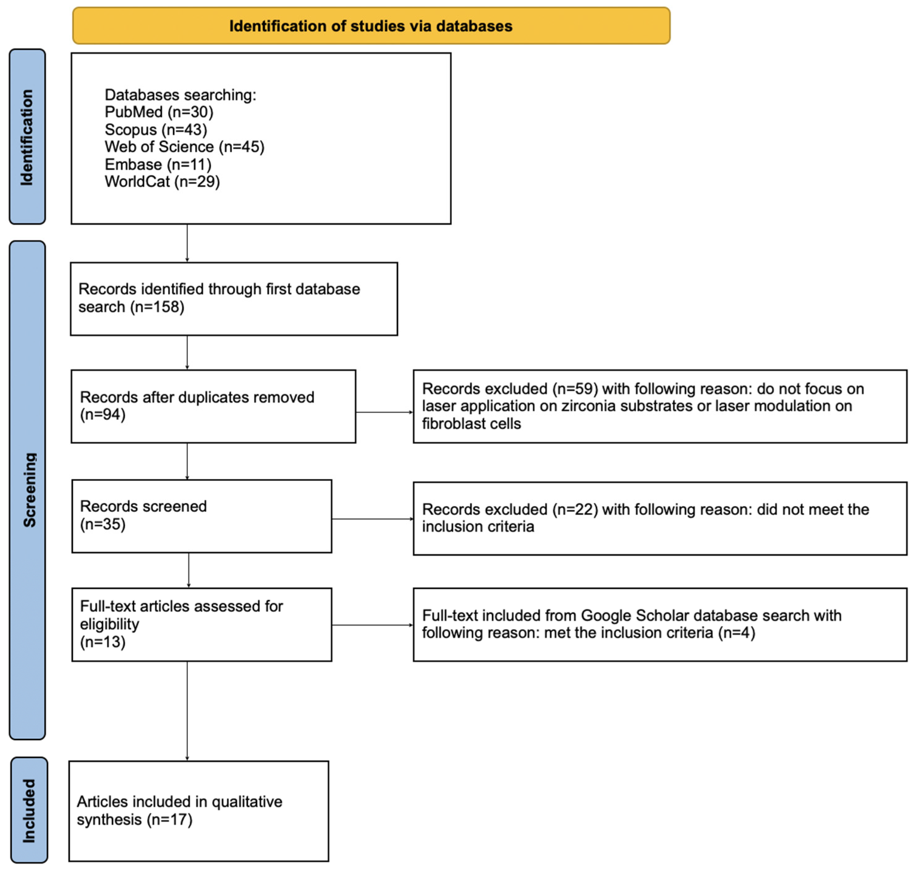 - Web of Science: TS = (laser AND fibroblast AND (zirconium OR zirconia OR ZrO2 OR Y-TZP) AND (implant OR disk OR specimens OR plates OR blocks))
