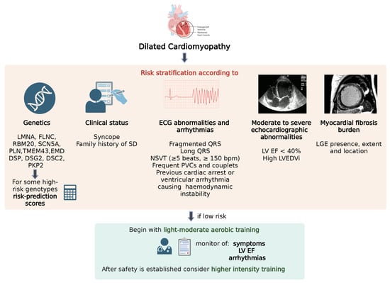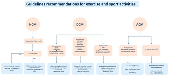 Dilated cardiomyopathy (DCM) is a disease of the myocardium, not associated with ischemia or valvular disease, in which ventricles become dilated and contractile function is reduced. Patients may have heart failure symptoms, arrhythmias and are at risk of sudden cardiac death. The pathophysiology is heterogeneous: it may be idiopathic, genetic, viral, drugs-related or have other, rarer, etiologies. Mutations associated with DCM predominantly involve genes encoding sarcomeric, cytoskeletal or nuclear envelope [2]. The most common gene related to DCM is titin (TTN) that is found in up to 25% of familial DCM cases, resulting in reduced sarcomere integrity and ventricular dilation [33]. Other genes include lamin A/C (LMNA), linked to a high risk of arrhythmias and sudden cardiac death, filamin C (FLNC), phospholamban (PLN), β-myosin heavy chain (MYH7), cardiac troponin T (TNT2) and desmin (DES) [2]. DCM is characterized by marked heterogeneity, encompassing variations in etiology, left ventricular systolic function, degree of myocardial fibrosis, clinical presentation, arrhythmic profile, and therapeutic response. DCM is the cardiomyopathy with the strongest evidence supporting the benefits of physical activity and cardiac rehabilitation. Most of this evidence, however, originates from studies in patients with heart failure with reduced ejection fraction and has been subsequently extrapolated to DCM, rather than being derived from DCM-specific investigations. Indeed, the 2023 ESC guidelines for the management of cardiomyopathies recommend exercise because it enhances NYHA functional class, cardiopulmonary performance, and overall quality of life [2]. Studies have shown that physical activity leads to better left ventricular function, reductions in end-systolic and sometimes end-diastolic volumes (consistent with reverse remodeling), and significant gains in functional capacity, with VO2 peak increasing by 8% to 27%. Quality of life and symptom burden are also favorably affected [34,35,36,37,38,39]. Improvements in functional capacity translate into better outcomes, as higher peak VO2 has been associated with a significantly lower risk of all-cause and cardiovascular mortality, as well as reduced rates of all-cause and cardiovascular hospitalization [37]. Regular low- to moderate-intensity exercise is recommended in all DCM patients [2]. On the contrary, symptomatic individuals with DCM are generally advised to avoid competitive sports and recreational activities of moderate to high intensity. Indeed, intensive exercise and competitive sports may precipitate fatal arrhythmias in DCM, particularly in patients carrying mutations associated with intrinsically high arrhythmic risk—such as LMNA, FLNC, transmembrane protein 43 (TMEM43), and PLN [2] or in patients with severely impaired left ventricular function (EF < 40%), complex arrhythmias, or with significant structural alterations such as ventricular dilation and fibrosis [40]. An appropriate risk stratification of the individual patient within expert cardiomyopathy center must precede exercise prescription (Figure 1). High-volume or -intensity exercise could increase wall stress, lead to adverse remodeling, promote fibrosis, or precipitate decompensation if underlying reserve is low. Therefore, the guidelines recommend that high-intensity exercise and competitive sport may be considered only in a select group of asymptomatic (NYHA functional class I), optimally treated individuals, without recent decompensation or history of unexplained syncope, with a left ventricular ejection fraction ≥ 50% and in the absence of exercise-induced complex arrhythmias [2]. In this case, it is suggested to begin with moderate aerobic training; monitor response (symptoms, ejection fraction, arrhythmias) and only after safety is established consider higher intensity training. An ongoing trial will provide valuable insights into the safety and efficacy of personalized exercise training in DCM patients, inform clinical practice and contribute to the development of heart failure management programs [41].