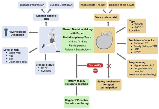 Shared decision-making (SDM). Emerging evidence and the growing integration of shared decision-making into clinical practice have contributed to a substantial evolution of guidelines and a paradigm shift in the management of athletes with cardiovascular disease who wish to return to play (RTP). The goal of SDM is to provide athletes with comprehensive information about the potential risks—including sudden cardiac death—and benefits of sports participation, while incorporating their values and preferences into the decision-making process. Risk stratification is individualized, taking into account sport type, age, sex, and diagnostic findings. Some athletes, after understanding their risk profile, may choose to self-disqualify, whereas others may elect to continue despite medical recommendations [61]. Importantly, SDM should involve not only the athlete but also their family, team, and all relevant stakeholders. When the patient is younger than 18 years, the discussion must be adapted to ensure decisions are shared between the pediatric patient and their parents, reflecting their collective values and priorities. Moreover, SDM must remain disease- and patient-specific, given that each cardiomyopathic substrate carries distinct arrhythmic and device-related risks. Finally, current international cardiology guidelines strongly caution against viewing ICD implantation as a ‘safety mechanism’ to justify sports participation, emphasizing that an ICD should never be implanted solely to permit competitive activity and its presence cannot be considered a safeguard that mitigates the intrinsic arrhythmic risk associated with high-intensity exercise [2,17,31]. In conclusion, contemporary data suggest that ICDs generally perform reliably in athletes with cardiomyopathies, but disease-specific risk remains an essential determinant of RTP decisions. A universal prohibition of sports is not supported; rather, an individualized, shared decision-making approach, ideally within expert multidisciplinary teams, represents the most balanced path forward (Figure 3).