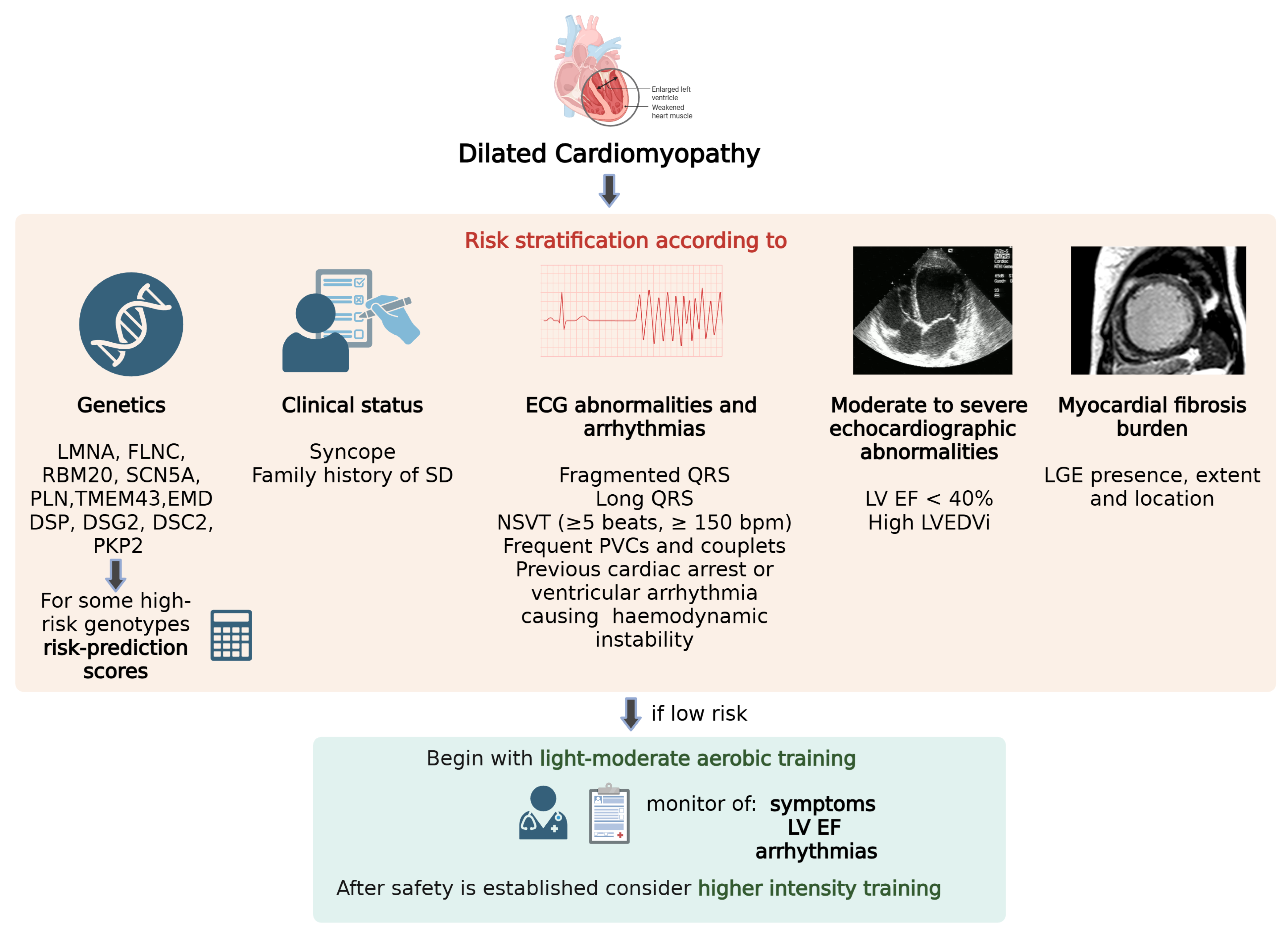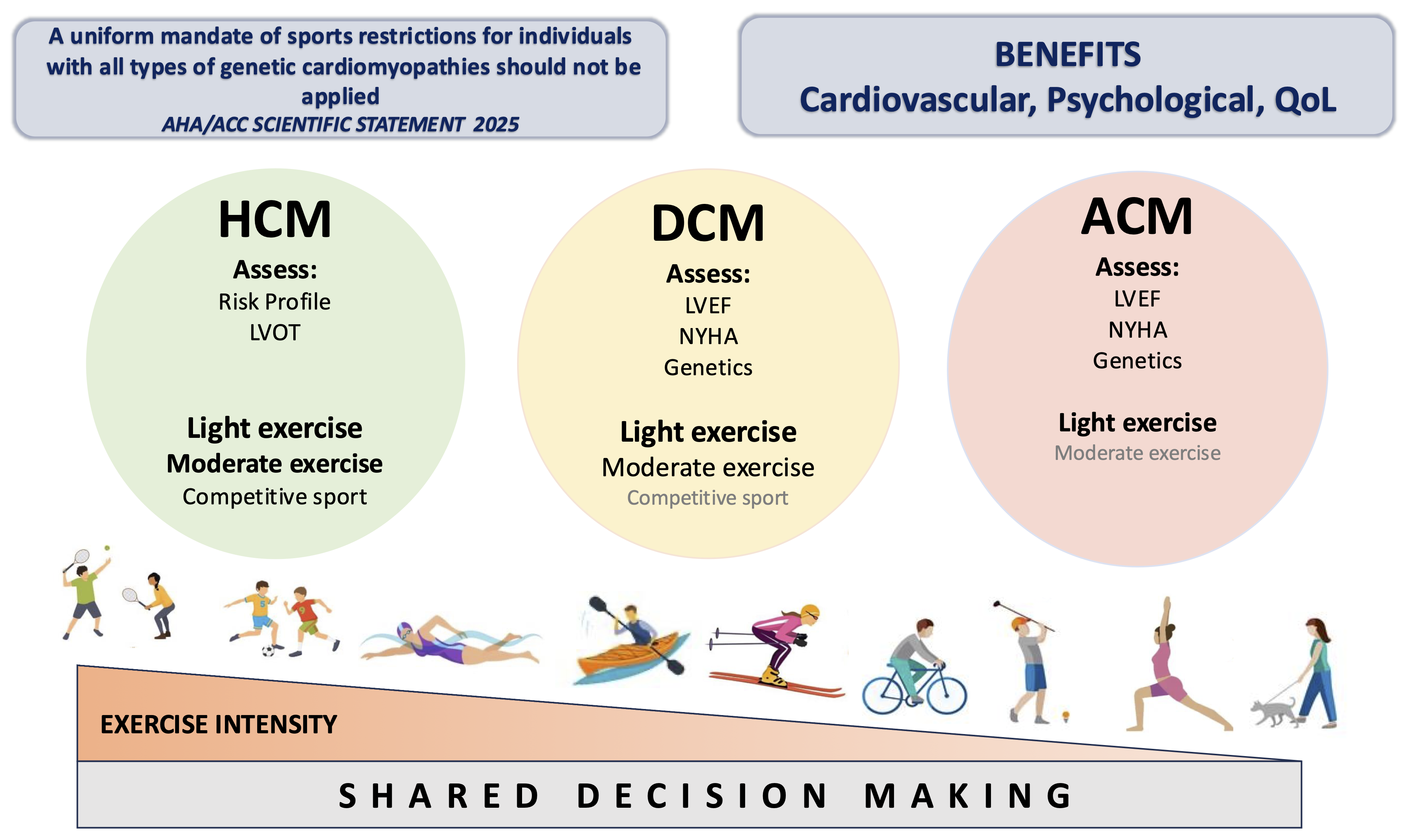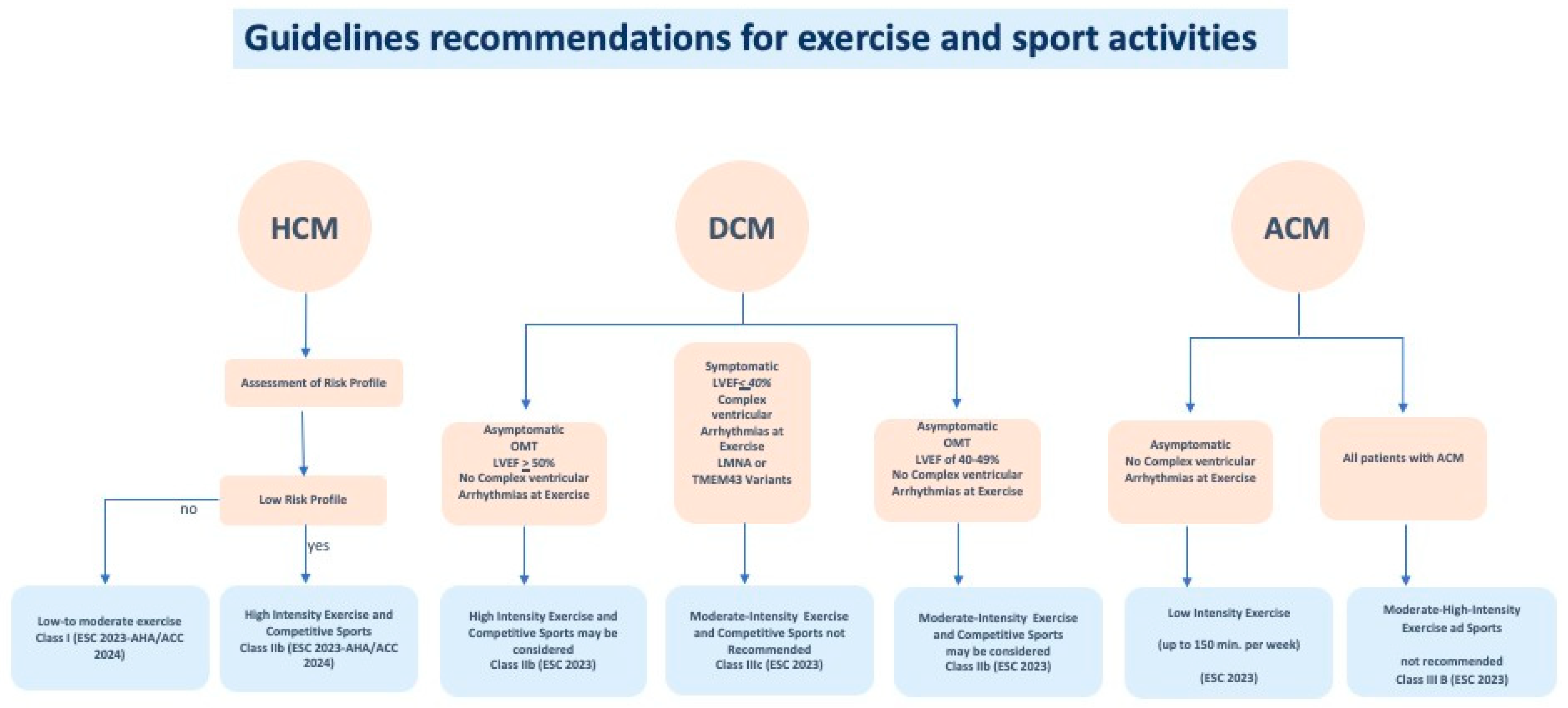 | Carriers of LMNA or TMEM43 variants | Exercise may worsen function and increase arrhythmic risk; avoid high-intensity and competitive sports. | IIb C | ESC 2023 [2] | |