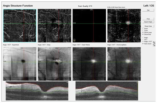 Optical coherence tomography angiography (OCTA, OptoVue Avanti XR version 2016.1.0.26, Optovue Inc., Fremont, California, United States of America) revealed normal retinal circulation in the RE, while the LE showed disruption of the superficial and deep capillary plexus with decreased vascular perfusion. Optical coherence tomography (OCT) displayed the hyper-reflectivity of the inner and the hypo-reflectivity of the outer retinal layers with increased central macular thickness and a loss of organized layer structure (Figure 2).
