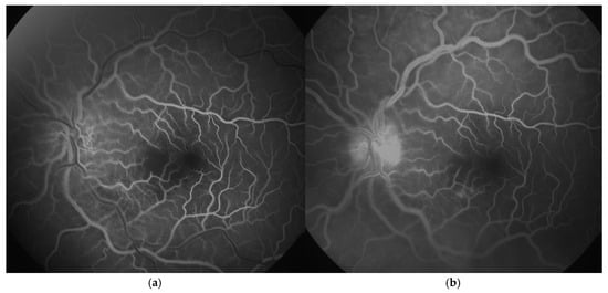 Fluorescein angiography (FA, Zeiss FF 450 plus, VISUPAC software, Jena, Germany) images of a six-year-old patient’s left eye with central retinal artery occlusion: (a). arteriovenous phase (reduced capillary perfusion in the papillomacular bundle and the inferonasal part of the macula); (b). late phase (delayed filling with slight dye leakage from retinal capillaries in the affected areas).