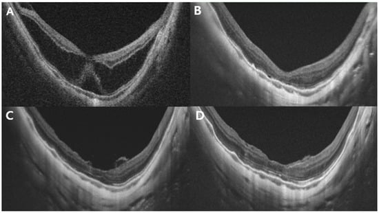The incidence of myopia has rapidly increased in the Asian population, and pathologic myopia can lead to visual impairment through posterior staphyloma, chorioretinal atrophy, and various stages of MTM [14]. MTM should be considered a spectrum of foveal tractional changes that occur in highly myopic eyes. It typically presents in various forms, such as foveoschisis, retinoschisis, foveal detachment, and lamellar or FTMH, with or without retinal detachment [15]. Parolini et al. organized these different patterns of MTM into the MSS to facilitate understanding and classification of the condition [2].