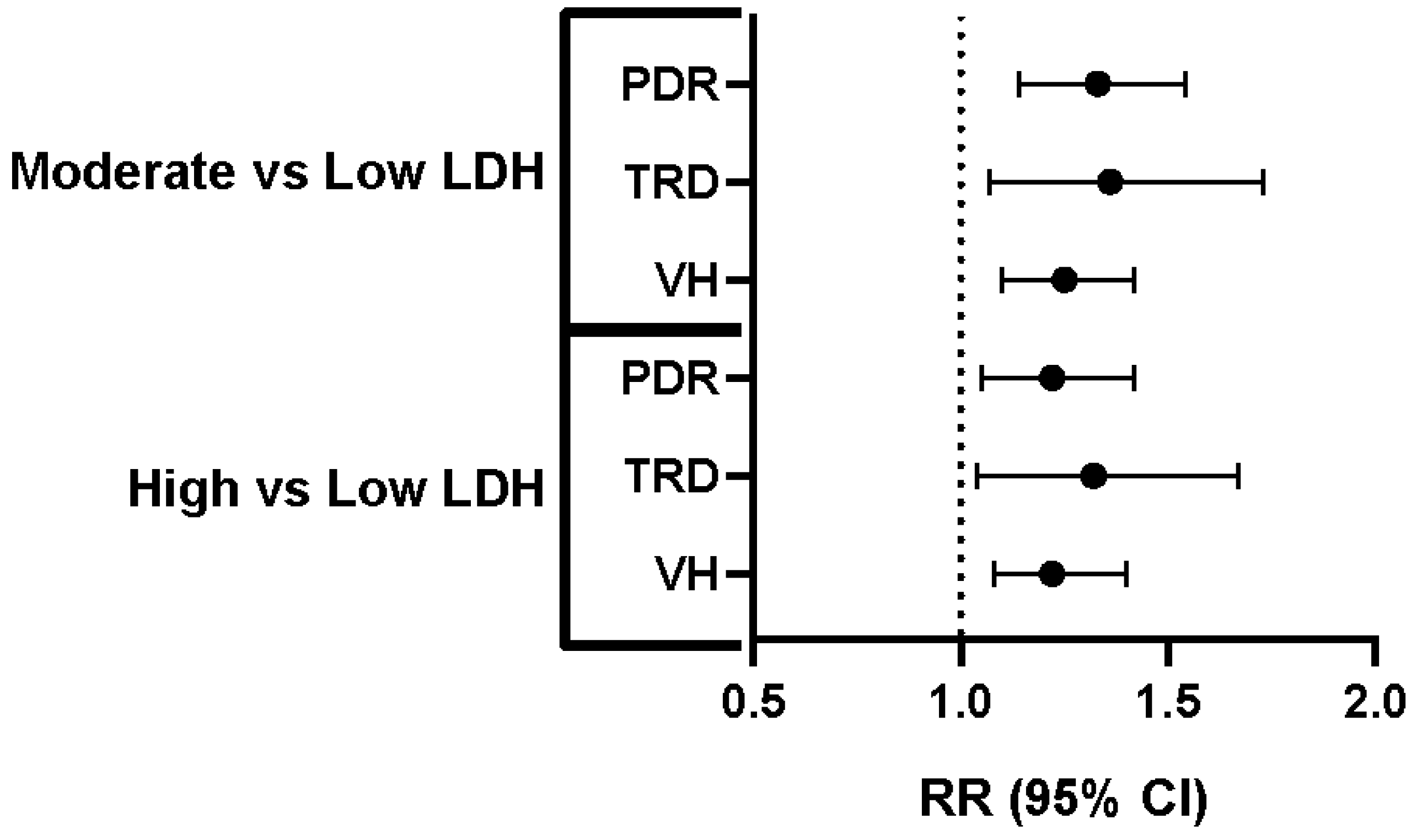 | Low vs. Moderate LDH | PDR | 2.96% | 3.93% | 1.33 (1.14–1.54) |