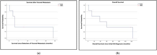 Kaplan–Meier survival analyses of patients 1–6: (a) Survival after detection of visceral metastasis (in months), (b) overall survival after OS diagnosis (in months). Abbreviations: OS, osteosarcoma; DOD, died of disease; AWD, alive with disease.
