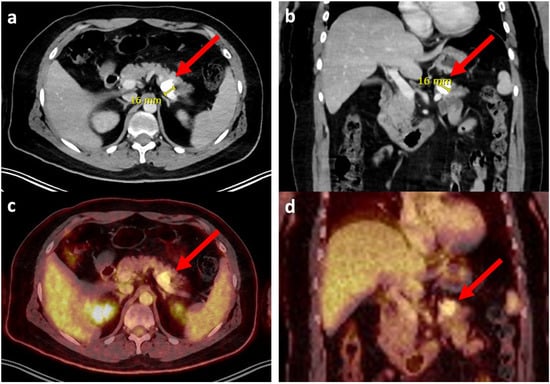 Multiplanar contrast-enhanced CT and FDG-PET/CT images demonstrating a calcified metastasis of the pancreatic tail (red arrow) in patient 1. (a) Axial CT showing the metastatic lesion of 11 mm extension. (b) Coronal CT confirming the extent and location of the lesion. (c) Axial fused FDG-PET/CT demonstrating increased FDG uptake corresponding to the CT-visible metastasis. (d) Coronal fused FDG-PET/CT further illustrates the metabolic activity of the lesion. Imaging was acquired on a Siemens Biograph 128 Vision Quadra PET-CT system using a whole-body protocol. CT acquisition was performed in the venous phase from skull to feet, with thin-slice reconstructions and evaluation in soft-tissue, lung, and bone windows. A total of 239 MBq of 18F-FDG and 80 mL of contrast agent (Iomeron 400) was administered intravenously. The dose-length product (DLP) for this examination was 1641 mGy*cm.