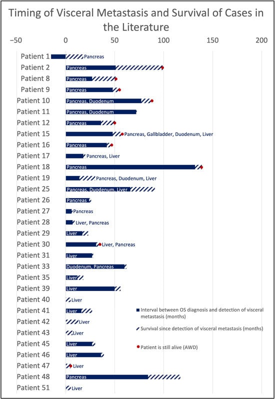 Among 51 patients with visceral metastases from conventional OS, 28 were female, and 22 were male; in one case, sex was unspecified. The median age at visceral metastasis was 27 years (mean, 32 years; range, 10–69 years), with a mean interval of three years between diagnosis and occurrence of visceral metastasis (range, 15 months prior to diagnosis–17 years). The longest observed metastatic intervals were 11 [35] and 17 years [36]. Both patients already had additional metastatic sites at the time of diagnosis. The mean overall survival was 43 months (range, 3–139 months). The time intervals for patients with available data in terms of metastasis interval and survival are visualized in Figure 5.