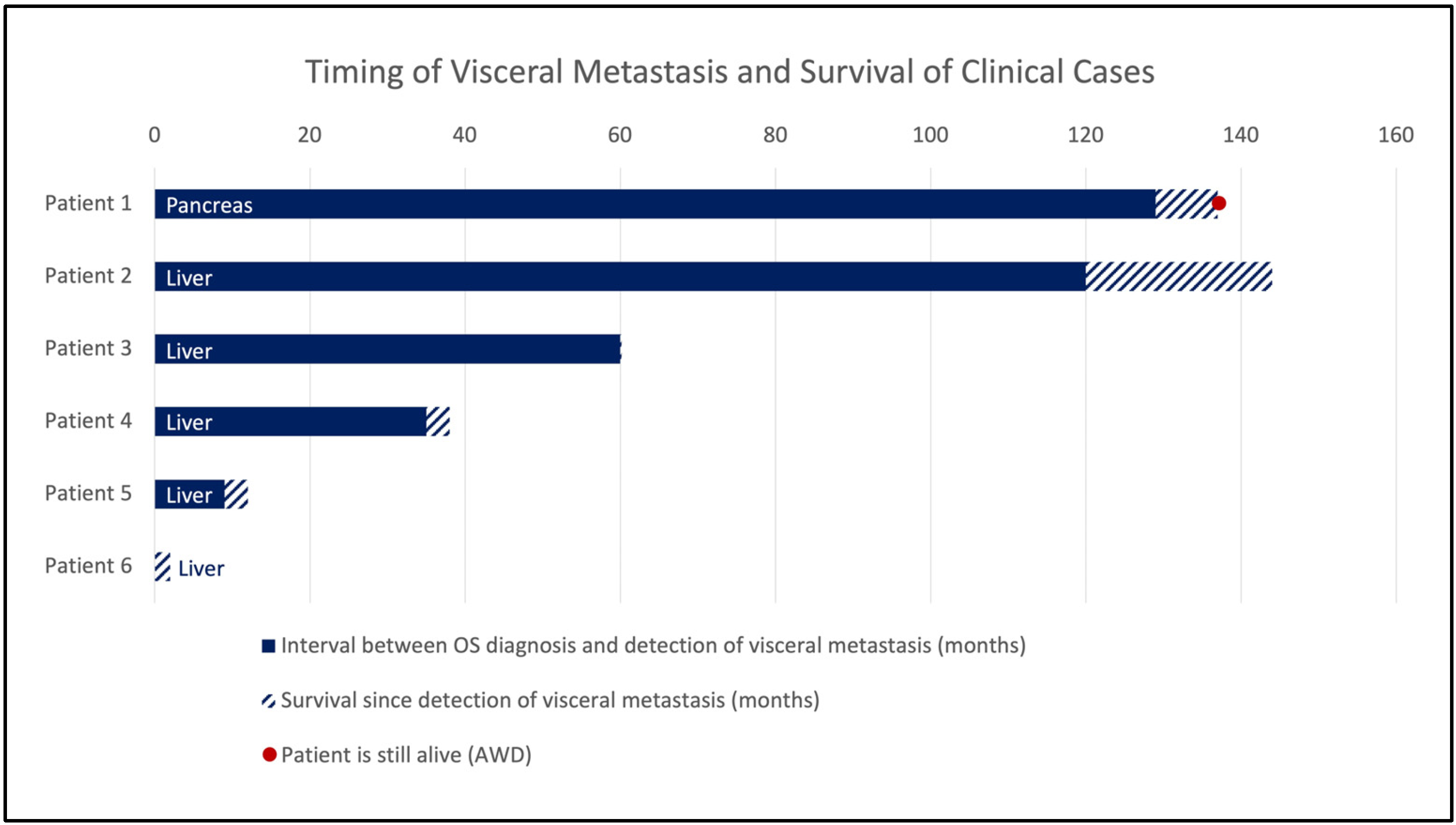 | 48 [59] | f | 23 | femur | 84 | n/a | pancreas | 170 | pancreatoduodenectomy | lung, LR in pancreatic tail 24 months postoperatively, died 9 months later | DOD | 33 |