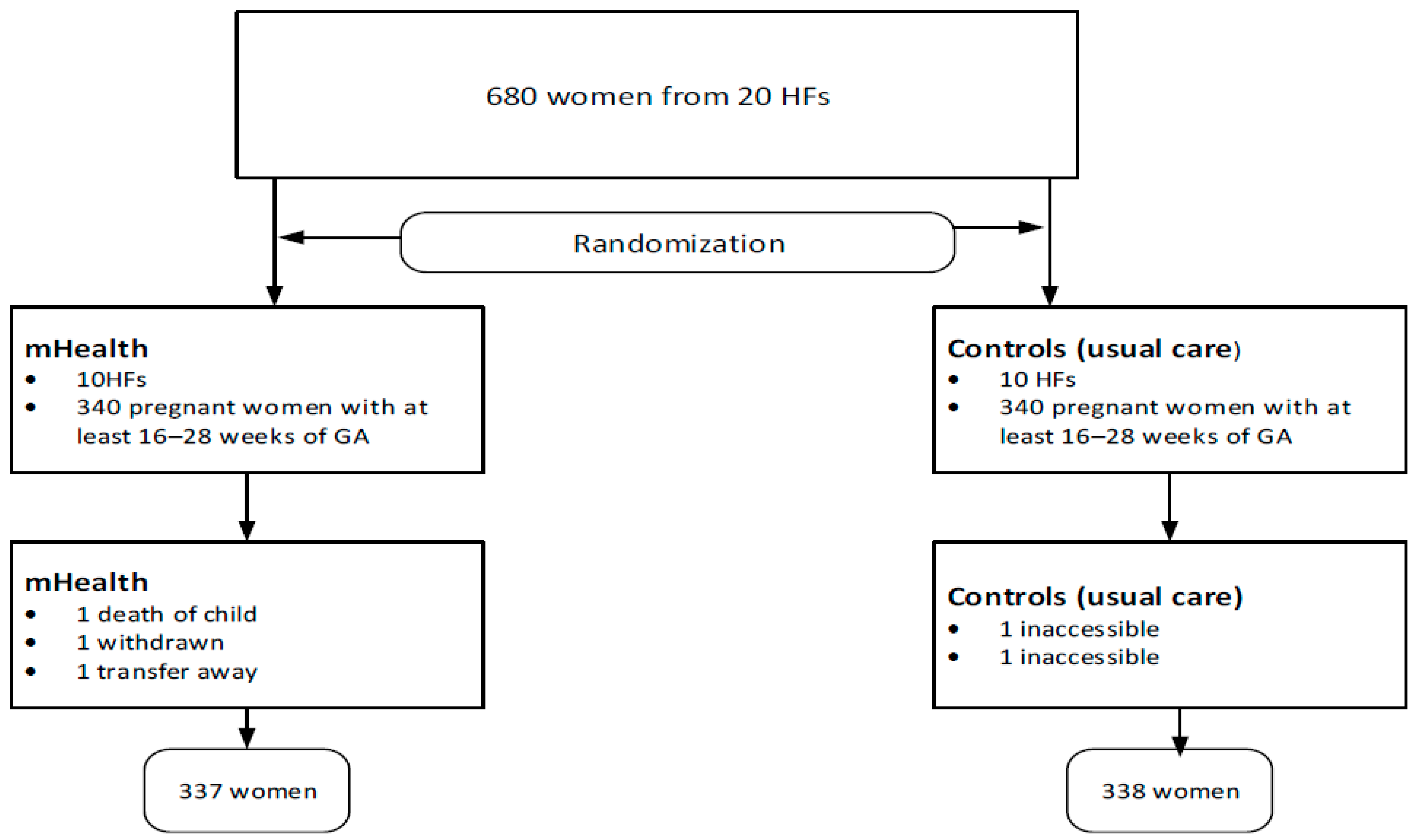 Figure 2 summarizes the research process. Pregnant women (680) from 20 health facilities, with gestational age of 16–28 weeks, were recruited into control and intervention arms. Four participants were lost and did not start the intervention. One participant was lost to follow-up after commencing the intervention. One of the mothers reported loss of the baby to respiratory illness in the second month (