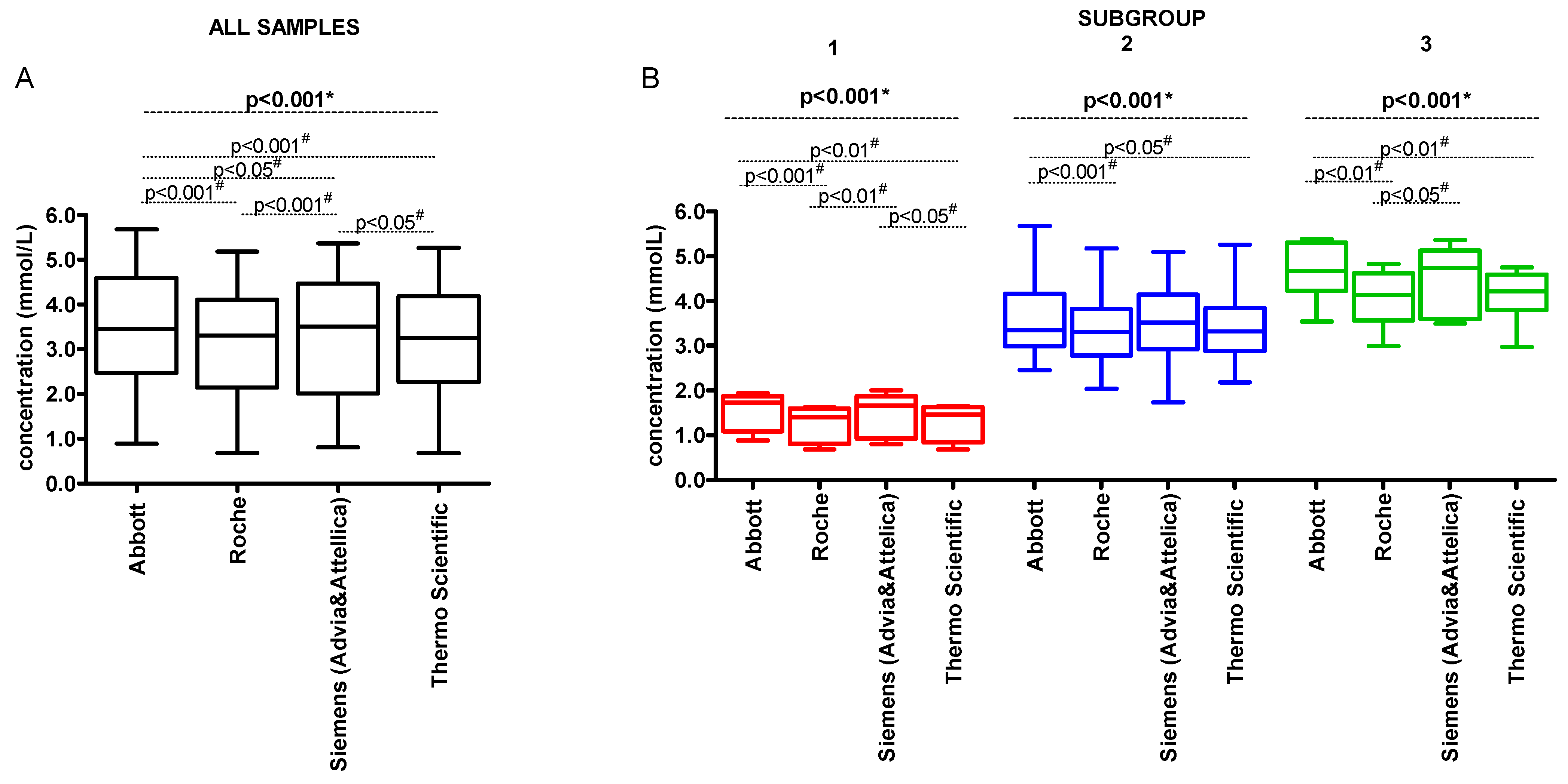 - Timón-Zapata, J.; Laserna-Mendieta, E.J.; Sáenz-Mateos, L.F.; Ruiz-Trujillo, L.; Arpa-Fernández, A.; Palomino-Muñoz, T.J.; Loeches-Jiménez, M.P.; Gómez-Serranillos, M. A Multicentre Analysis of Four Low-Density Lipoprotein Cholesterol Direct Assays in Samples with Extreme High-Density Lipoprotein Cholesterol Concentrations. Clin. Chim. Acta 2014, 430, 71–76. [Google Scholar] [CrossRef] [PubMed]