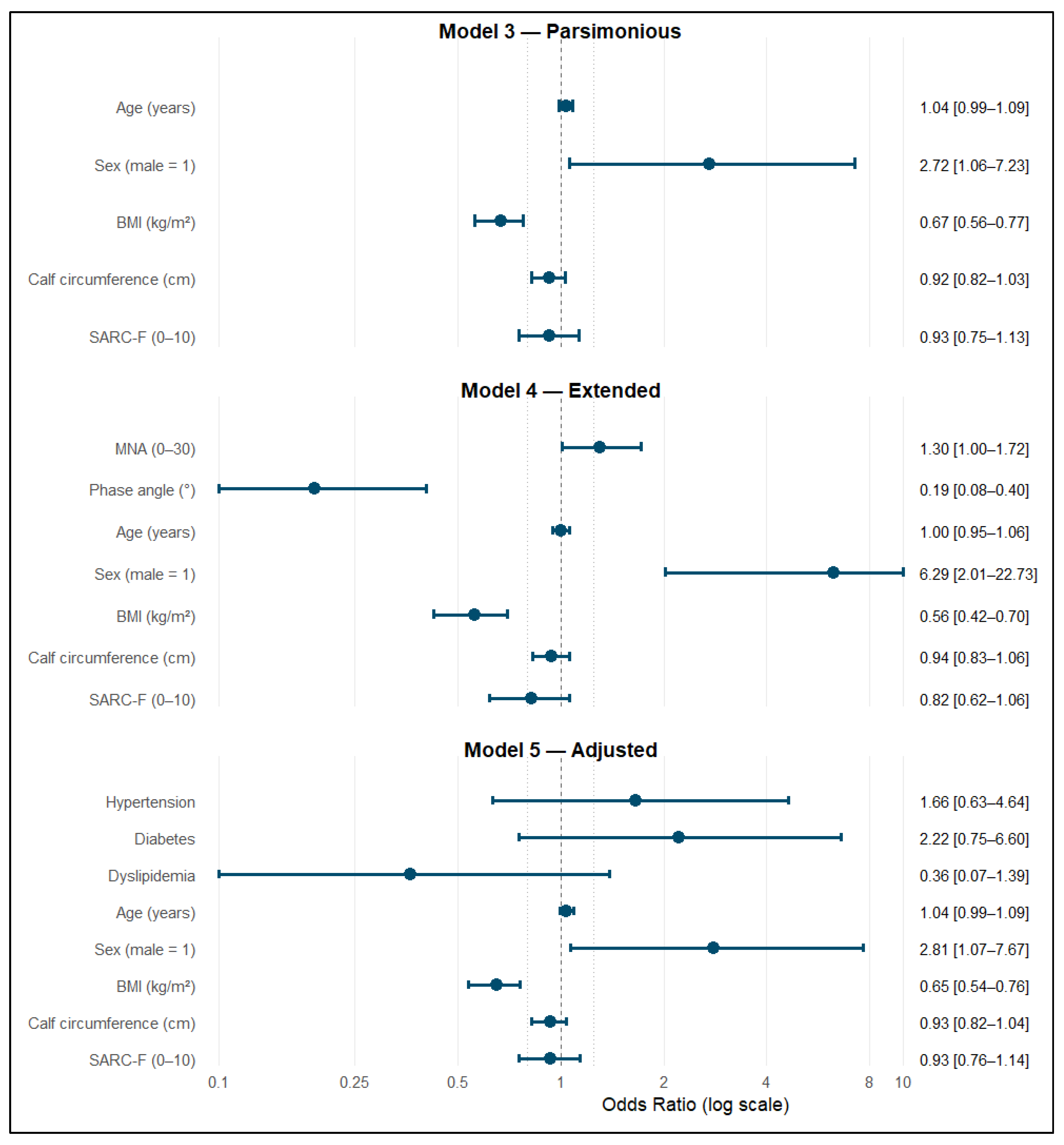 In M4, sex remained strongly predictive (OR = 6.29; 95% CI 2.01–22.73; p = 0.0026), BMI maintained an inverse relationship (OR = 0.56; 95% CI 0.42–0.70; p < 0.001), and PhA proved to be a powerful independent factor (OR = 0.19; 95% CI 0.08–0.40; p < 0.001). In M5, sex (OR = 2.81; 95% CI 1.07–7.67; p = 0.039) and BMI (OR = 0.65; 95% CI 0.54–0.76; p < 0.001) remained significant, while comorbidities did not reach significance (all p > 0.10).