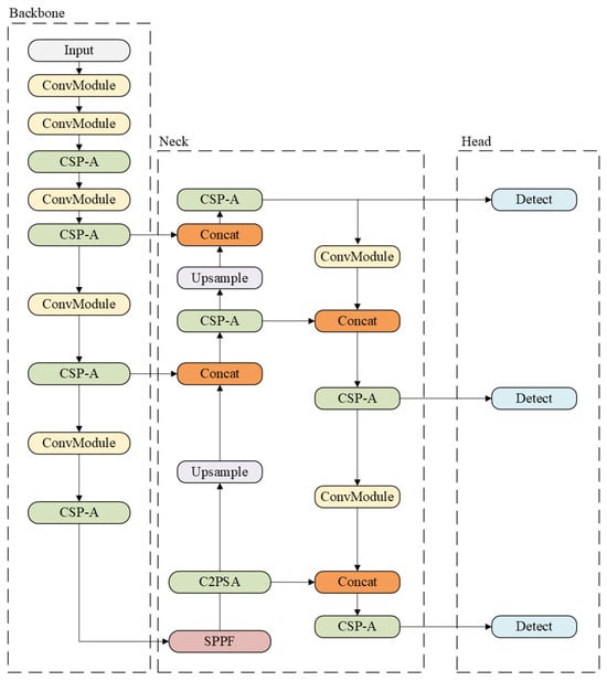 The architecture of YOLOv11 (see Figure 2) has changed mainly in the use of the ConvModule block, the SPFF module, and the CSP-A block. These blocks enhance the ability of YOLOv11 to process spatial information while maintaining high-speed inference.