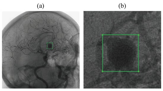 In Figure 3, each annotation corresponds to a rectangular bounding box defined by its upper-left and lower-right corners. Most patients in the dataset had a single aneurysm; in two cases, multiple aneurysms were present. Each image includes a binary (0–1) annotation that is applied only when an aneurysm is visible. Some aneurysms are not visible from certain viewing angles, and in those cases, no annotation is provided. Within the full image, aneurysms are typically discernible to the human eye only when magnified.