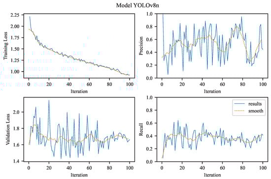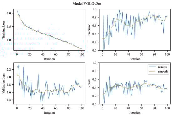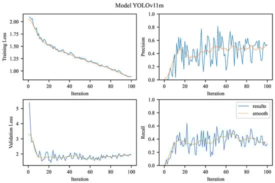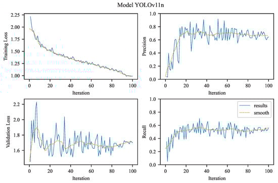 The training process was conducted using the Adam optimizer with its default momentum settings, which provided stable and adaptive optimization throughout the training. An initial learning rate of 0.001 was used, regulated by a cosine annealing scheduler to gradually reduce the rate during training, promoting smoother convergence. A batch size of 16 was chosen to balance memory usage and training efficiency. Each model was trained for a maximum of 100 epochs, with early stopping applied based on validation loss to prevent overfitting. Weight decay was set to to regularize the model and discourage over-complex solutions. Training was performed on an NVIDIA RTX 3090 GPU, with each model requiring approximately 6 to 8 h to complete. However, smaller models like YOLOv8n and YOLOv11n trained more quickly due to their lightweight architectures and reduced computational requirements. To improve the robustness and generalization of the models, several data augmentation techniques were applied during training. These included horizontal and vertical flips, random rotations within ±10 degrees, and random adjustments to brightness and contrast. Mosaic augmentation, a technique supported by the YOLO framework, was also used to combine four images into one, enhancing the model’s ability to detect objects in varied and complex contexts. Model checkpointing was based on validation performance, with the best-performing model (in terms of F1-score) saved during training. Validation was performed after each epoch to monitor performance and enable early stopping when no further improvements were observed. Summary of training details: