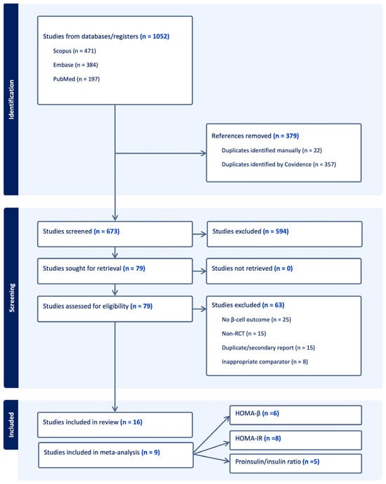 A systematic literature search was conducted across three major databases, PubMed, Embase, and Scopus, from inception to 15 April 2025. The search strategy included a combination of controlled vocabulary (e.g., MeSH terms) and free-text keywords to capture both indexed and non-indexed literature relevant to the effect of semaglutide on pancreatic β-cell function in adults with type 2 diabetes. Combined search terms included “semaglutide”, “type 2 diabetes”, and “β-cell function”. No filters were applied, and additional eligible studies were identified by manually screening the reference lists of included articles. Gray literature sources and clinical trial registries were not part of the predefined search strategy, as this review focused on peer-reviewed published studies to ensure methodological consistency and comparable study quality. The full database-specific search strategies are presented in Table S2.