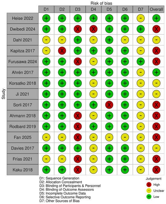 The risk of bias for the studies was carried out using the Cochrane Risk of Bias (RoB 1) tool [22]. The risk of bias assessment for all trials is shown in Figure 2. Overall, 8/15 studies were double-blinded, and the other 7 were open-label. Only two studies showed low risk of bias, and four showed some concerns. Because less than 10 studies were included in the meta-analysis for each outcome, funnel plots and Egger tests were not used to assess publication bias.