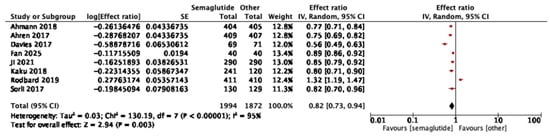 Eight studies reported HOMA-IR outcomes. Semaglutide reduced insulin resistance compared with comparators (pooled effect ratio 0.82, 95% CI: 0.73–0.94; I2 = 95%) (Figure 4). Sensitivity analysis excluding one study [34] reduced heterogeneity to I2 = 90% and yielded a pooled effect of 0.77 (95% CI: 0.70–0.85), confirming robustness of the result. In dose-stratified analysis, semaglutide 1.0 mg showed a stronger effect (0.75, 95% CI: 0.68–0.84; six studies, I2 = 85%) than 0.5 mg (0.90, 95% CI: 0.87–0.92; five studies, I2 = 0%), with a significant subgroup difference (p = 0.002, I2 = 89.5%) as shown in Figure S2.