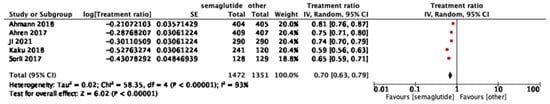 Treatment ratio for HOMA-IR between semaglutide and comparators [25,26,29,30,33,34,37,40].