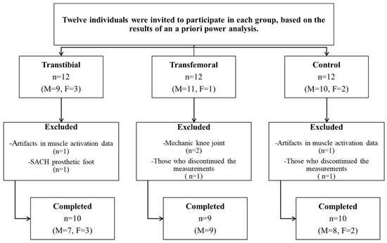 An a priori power analysis was conducted using G*Power (version 3.1.9.7, University of Düsseldorf, Germany) based on pilot data from five unilateral TTAs and five unilateral TFAs. Using the means and standard deviations of the anteroposterior postural sway range compliant surface eyes open (Cohen’s d = 1.990) and the forward perturbation intact side (IS) rectus femoris (RF) data (Cohen’s d = 1.162), it was determined that sample sizes of 5 and 10 subjects per group, respectively, would be required to achieve a power of 0.80 at a significance level of 0.05. For this reason, twelve individuals were invited to participate in each of the TTA and TFA groups and an equal number of healthy individuals were invited to form the CG. However, individuals with artifacts in muscle activation data, those using mechanical knee joints or SACH prosthetic feet, and those who discontinued the measurements were excluded from the study. The study was completed with 29 participants: 10 with unilateral TTAs (7 males, 3 females), 9 with unilateral TFAs (9 males), and 10 in the CG (8 males, 2 females) (Figure 1).