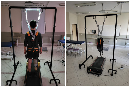 The measurements were conducted, as in postural control assessments, with participants wearing the footwear they use in daily life. Participants were instructed to place their feet in a self-selected comfortable position symmetrically aligned with the center line of the treadmill and to stand facing forward with their arms relaxed at their sides. To prevent falling and hitting the ground or the treadmill, participants were attached to a steel-framed suspension safety system with a parachute-type harness designed not to support body weight (Figure 2). To minimize excessive fear and/or startle responses that could occur during surface perturbations, a few familiarization trials were conducted before the test. The perturbations in the test protocol were administered in a mixed order (five forward and five backward) based on a random number table ranging from 1 to 10 [22]. This randomization was designed to prevent predictive biomechanical adjustments.