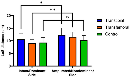 Significant differences (0.01 < p < 0.05) are indicated by an asterisk (*). Significant differences (p < 0.01) are indicated by an asterisk (**). “ns” represents non-significant p-values. LoS represents Limits of Stability. Mean (±SD) LoS distances intact/dominant and amputated/nondominant sides across the three groups.