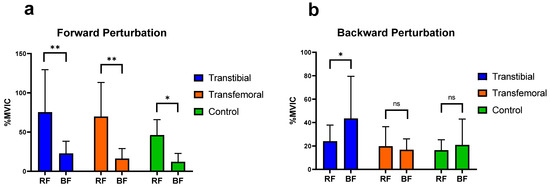 Significant differences (0.01 < p < 0.05) are indicated by an asterisk (*). Significant differences (p < 0.01) are indicated by an asterisk (**). “ns” represents non-significant p-values. RF: Rectus Femoris, BF: Biceps Femoris. %MVIC: Percentage of maximum voluntary isometric contraction. (a) Mean (±SD) %MVIC values of the thigh muscles on the intact/dominant side during forward perturbations. (b) Mean (±SD) %MVIC values of the thigh (knee) muscles on the intact/dominant side during backward perturbations.