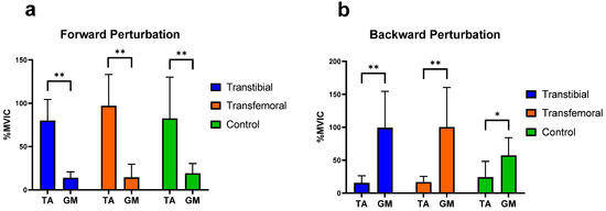 Significant differences (0.01 < p < 0.05) are indicated by an asterisk (*). Significant differences (p < 0.01) are indicated by an asterisk (**). TA: Tibialis anterior, GM: Medial head of gastrocnemius. %MVIC: Percentage of maximum voluntary isometric contraction. (a) Mean (±SD) %MVIC values of the leg muscles on the intact/dominant side during forward perturbations. (b) Mean (±SD) %MVIC values of the leg muscles on the intact/dominant side during backward perturbations.