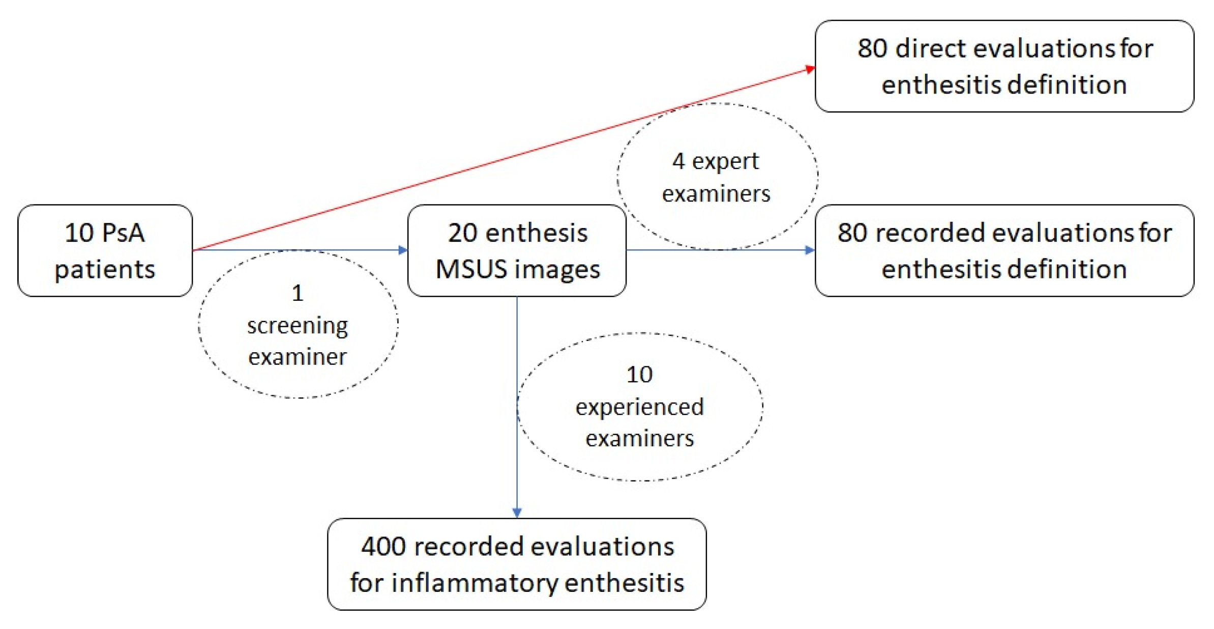 23], who attended the outpatient clinic, were interviewed and underwent both clinical and ultrasonographical assessment of the bilateral Achilles tendon on five randomly selected days in November 2024 by the same screening examiner (C.E.I.) who was not included in the inter-observer study. Exclusion criteria were recent trauma in the lower limb, surgical interventions on the lower limb, or injections at the enthesis or adjacent structures within the preceding six months, as well as initiation or modification of conventional synthetic or biologic disease-modifying antirheumatic drugs (cs/bDMARDs) and/or glucocorticoid therapy during the same period. To ensure randomization, on each study day, the first two eligible patients presenting with symptoms related to the Achilles tendon and/or clinical signs of inflammation were subsequently scanned on the same day by four other examiners (M.A., L.E., B.D., and D.E.M.), all with expert-level experience in MSUS and trained in the OMERACT enthesitis definition. The participating examiners were blinded to the findings or interpretations of the other assessors. This evaluation is referred to as the “direct inter-observer study” for enthesitis definition, where patients were examined directly at the time of presentation. In December 2024, the same four examiners also assessed the original ultrasound images obtained by the screening examiner; this part is referred to as the “recorded inter-observer study” for enthesitis definition. The original ultrasound images obtained by the screening examiner were also reviewed for the diagnosis of inflammatory enthesitis by ten other rheumatologists with at least five years of experience and training in MSUS; this part is referred to as the “recorded inter-observer study” for inflammatory enthesitis (