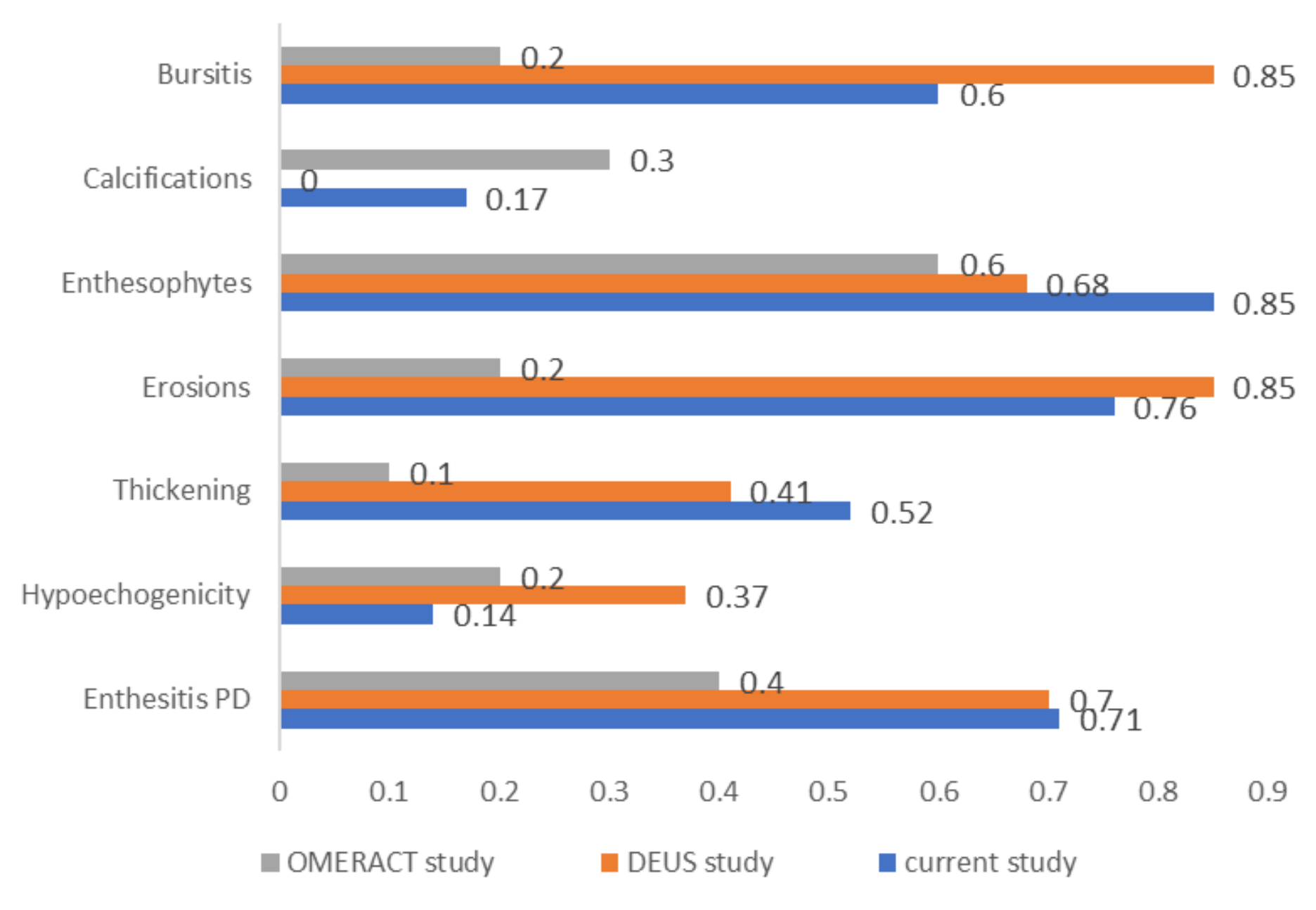 7] also published a validation study. This showed substantial agreement for enthesophytes (κ = 0.6) and moderate agreement for calcifications (κ = 0.3) and PD signal (κ = 0.4), while other features, such as erosions (κ =0.2), thickening (κ = 0.1), and hypoechogenicity (κ = 0.2), demonstrated lower levels of agreement. Overall, the κ values for most parameters in our study were higher than those reported in the OMERACT validation study.