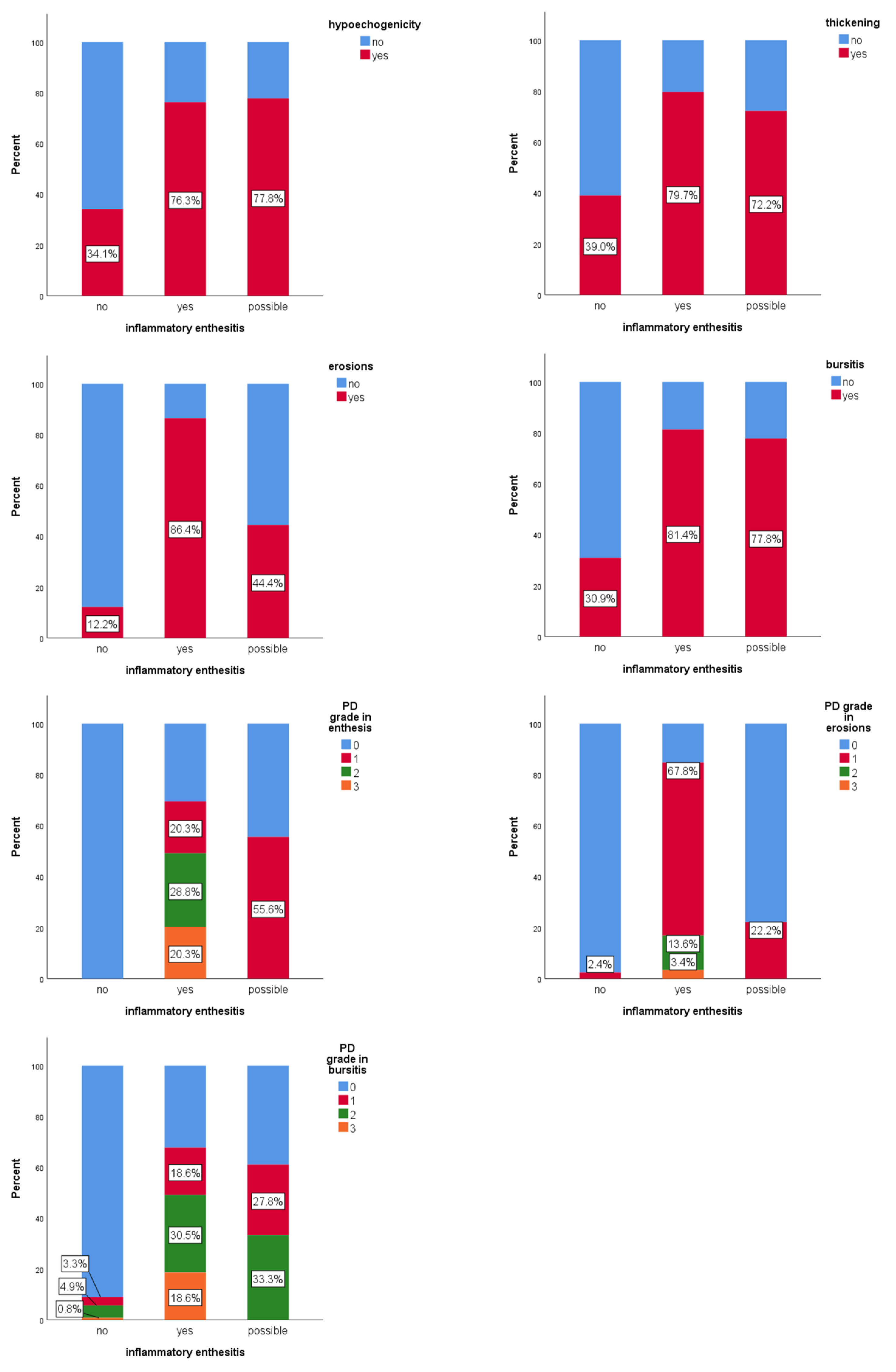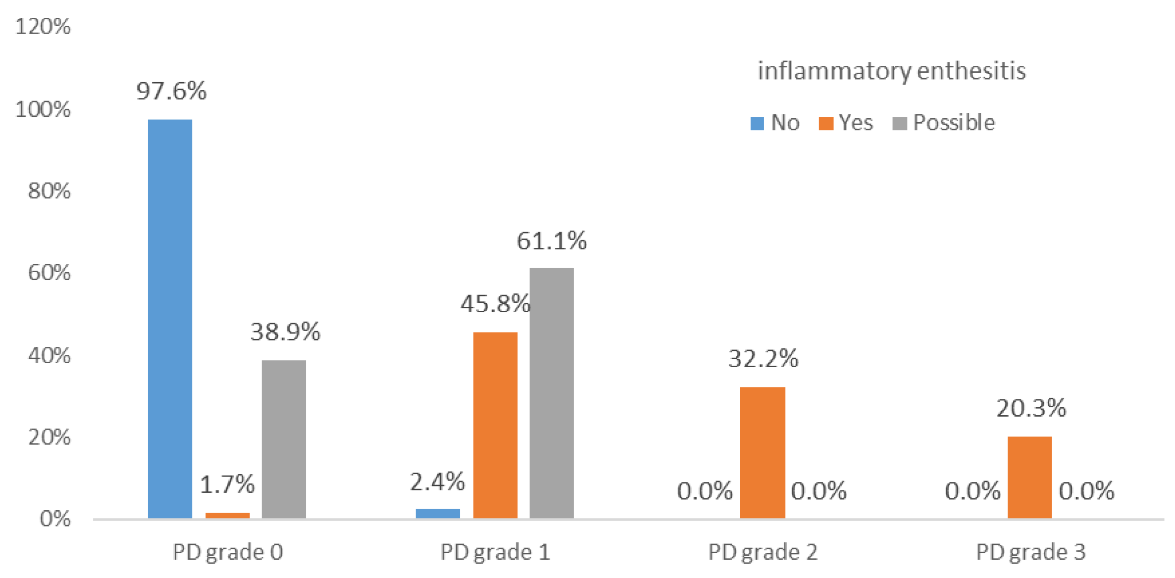 PD grades 2 and 3, in the enthesis, erosion, or combined (enthesis and erosion), occurred only in confirmed enthesitis cases. Grade 3 PD in the bursa was also present only in confirmed cases (