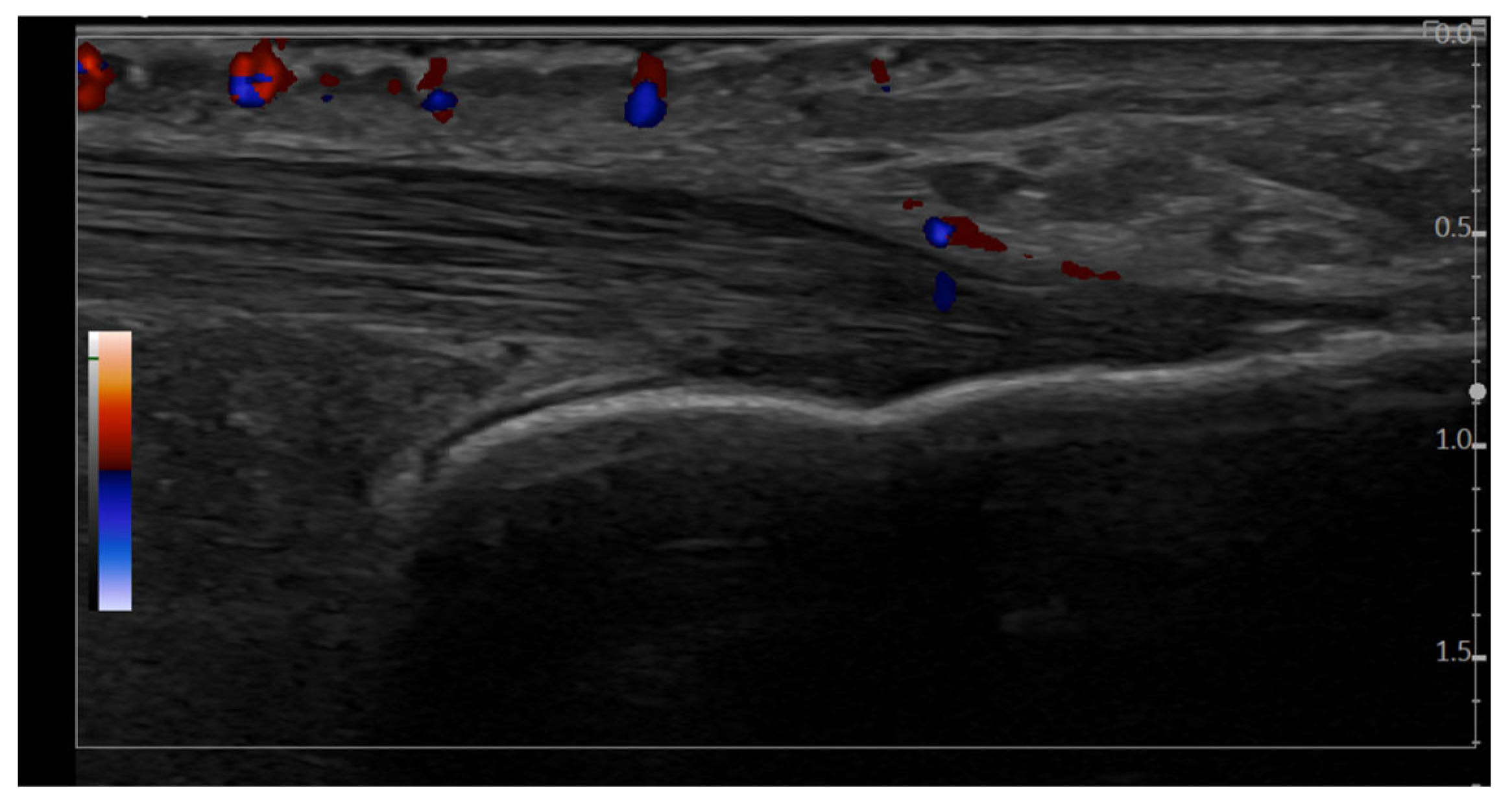 24], utilizing a GE LOGIQ E10 machine (GE Healthcare, Chicago, IL, USA; grayscale (GS) and PD, 4–20 MHz linear probe). Thus, each patient underwent 4 examinations of the same enthesis. Also, there were recorded images of each enthesis. Each image was centered on the enthesis, with measurement of entheseal thickness at the insertion, perpendicular to the tendon surface, and the distance from the PD signal to the cortical bone was recorded according to EULAR guidelines for image acquisition in rheumatology [