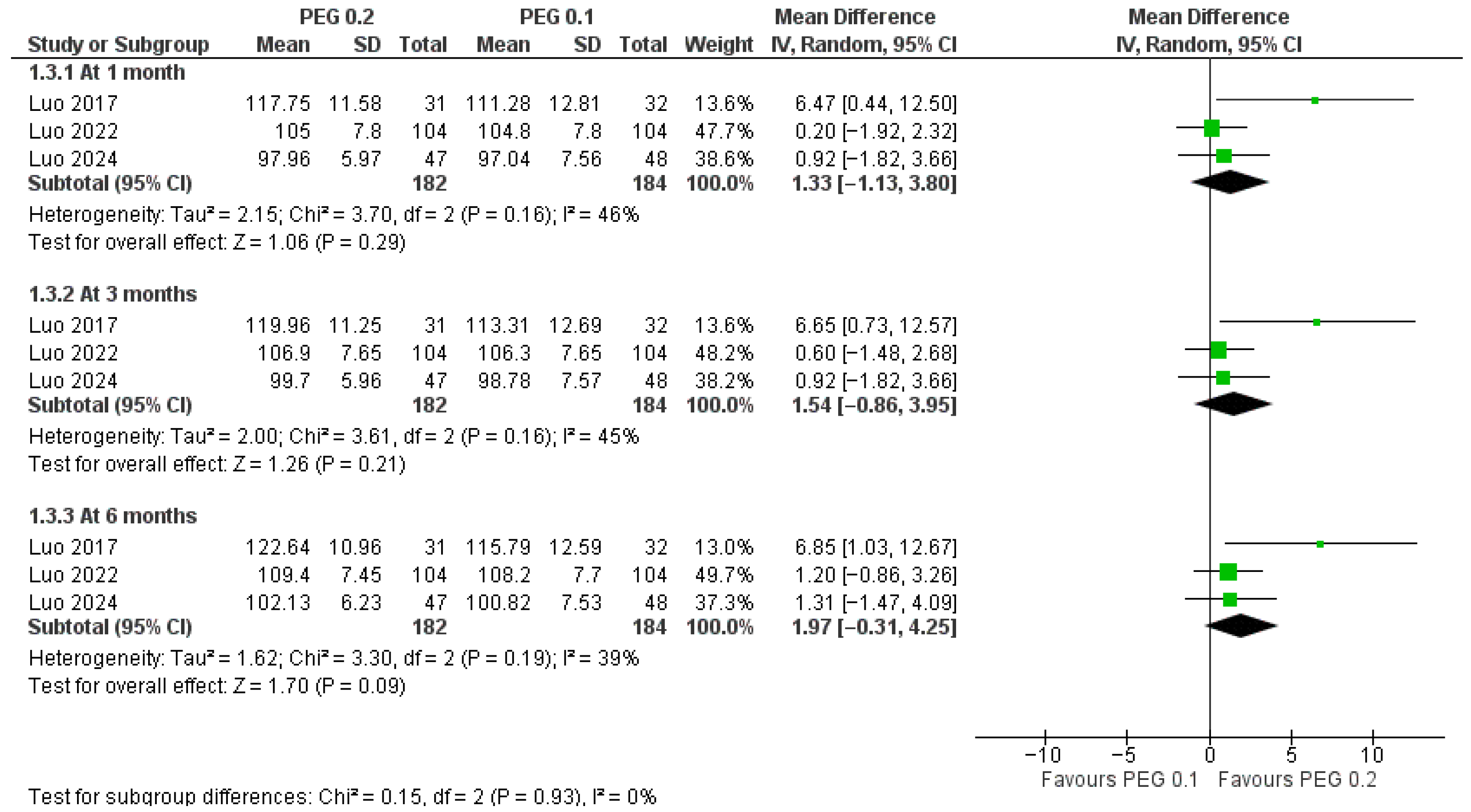 | Luo 2017 (a) [23] | RCT | PEG-rhGH 0.1 mg/kg/week | Daily rhGH 0.25 mg/kg/week | 32 | 34 | 10.91 (3.31) | 10.54 (4.05) | 23 (71.88) | 23 (67.65) | 20.5 (7.23) | 20.18 (6.06) |