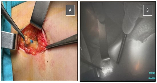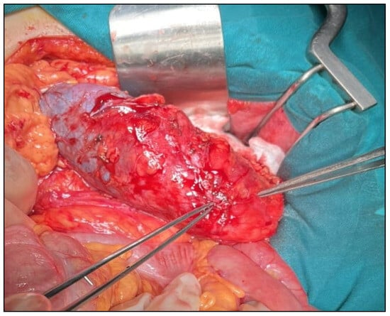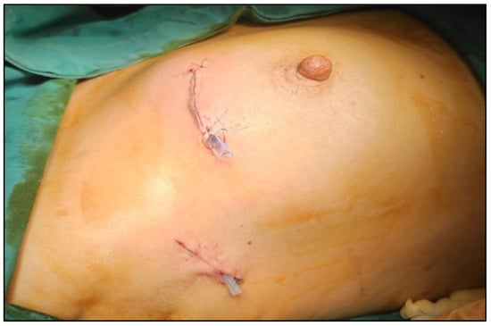 The multidisciplinary team decided to perform, in the same procedure, a partial resection of the right breast with tumor localization and sentinel lymph node biopsy using dual tracers (indocyanine green—ICG and methylene blue), as well as left nephrectomy, which was successfully carried out in our institution (Figure 3, Figure 4 and Figure 5).