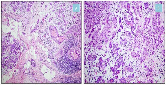 Moderately differentiated invasive ductal carcinoma of the breast (H&E). (A) Transition between malignant and non-neoplastic tissue (×100). (B) Malignant epithelial nests infiltrating fibrous stroma and intermingling with normal mammary ducts (×200).