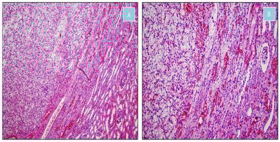 Clear cell renal cell carcinoma (H&E). (A) Nests of clear cells separated by a delicate vascular network, sharply demarcated from adjacent renal parenchyma (×100). (B) Transition between clear cell renal cell carcinoma and normal renal tissue (×200).