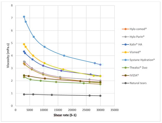 −1 was determined to be 0.91 ± 0.02 mPa·s, serving as the physiological reference point for comparing commercial formulations. The viscosity over the range of shear rates was significantly different for natural tears relative to that of all the other lubricants tested (