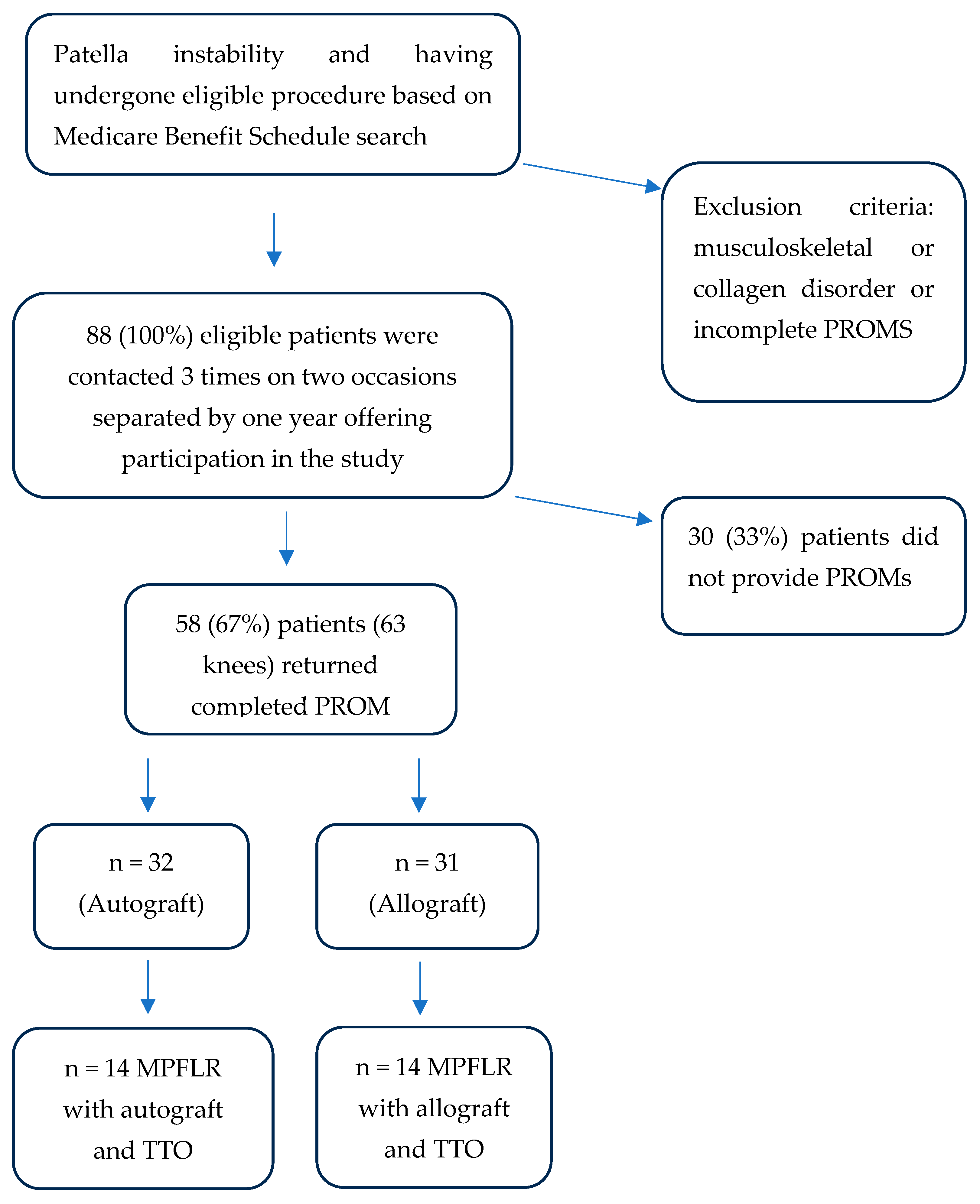 18]. Furthermore, little research has compared isolated MPFLR being a soft tissue procedure for patella stabilisation to MPFLR with TTO which offers a technique for altering osseous anatomy to improve patella stability. Lastly, we analysed recurrence rates of lateral patella dislocation following patella stabilisation surgery. We hypothesise that there will be similar PROMS and recurrent lateral patella dislocations rates following MPFL reconstruction with either autograft or allograft.