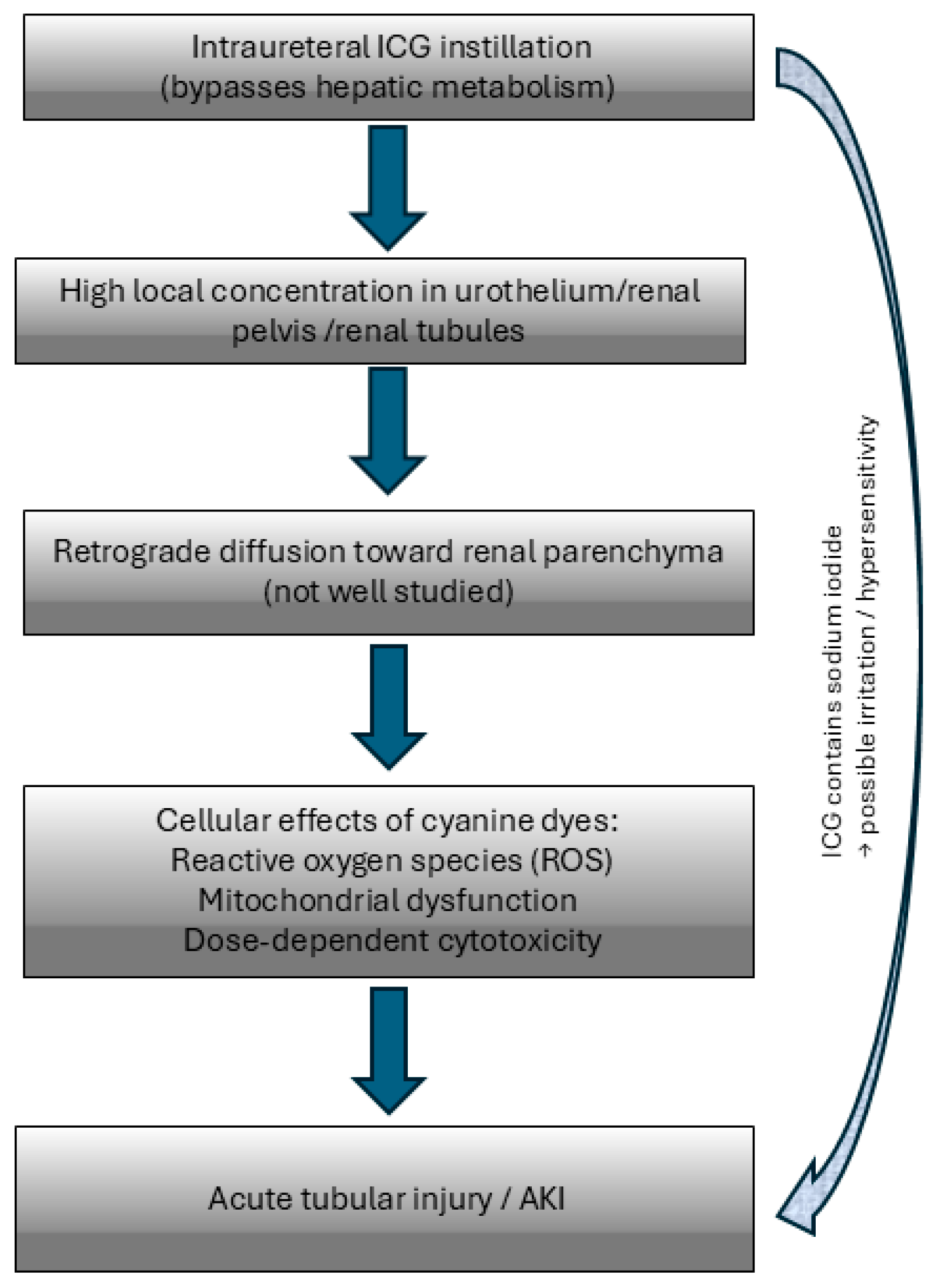 - Engage nephrology early if oliguria or anuria develops after ICG exposure.