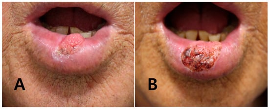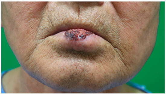 - Leite, A.F.S.D.A.; Lanaro, N.D.; de Oliveira, S.P.; Santos-Silva, A.R.; Vargas, P.A.; Lopes, M.A.; Jorge, J. Verrucous squamous cell carcinoma of the lower lip: A case report. Oral Surg. Oral Med. Oral Pathol. Oral Radiol. 2018, 126, e85. [Google Scholar] [CrossRef]